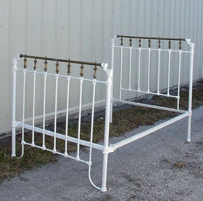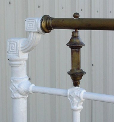 ANTIQUE IRON AND BRASS BED: White painted iron bed, 56''h. headboard, 48 1/2'' footboard. 54 1/2''w. overall. Rails included.