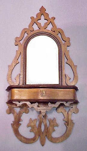 VICTORIAN WALNUT SHAVING OR DRESSING MIRROR: Wall mount mirror with shaped cut outs and hinged top storage shelf. 26''h, 13''at the widest.