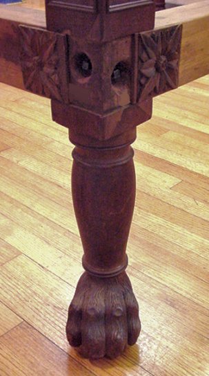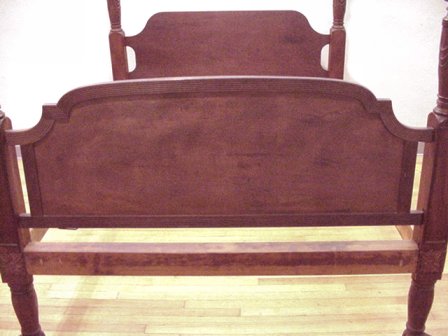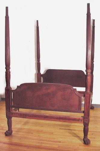 19TH CENTURY CARVED WEST INDIES? PLANTATION BED: Extraordinarily heavy, solid mahogany construction. Approx. size of bed frame is 93''h, 82''l, 60''w. Approx. size of interior (for mattress) is 75 3/4''l, 53 3/4''w.''