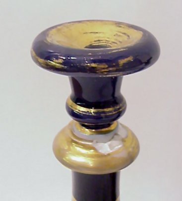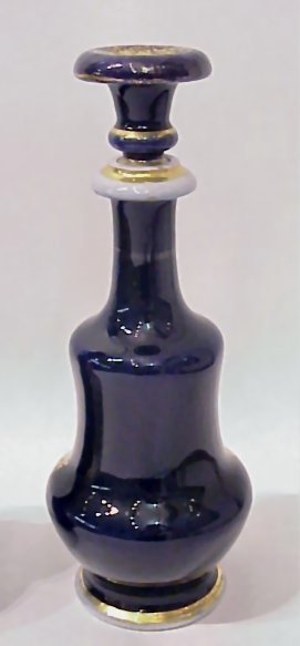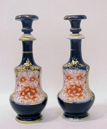 PAIR OF COBALT PORCELAIN SCENT BOTTLES: Iron red and gold floral decoration. 9 1/2''h, including stopper. Please note damage to rim of one bottle.