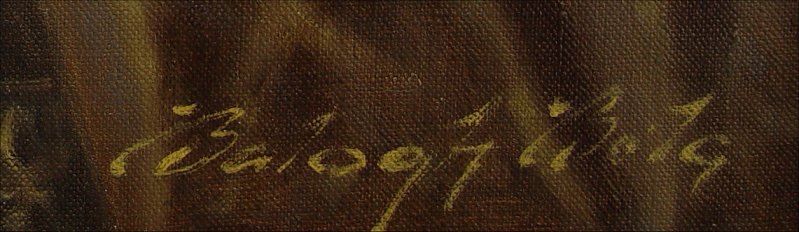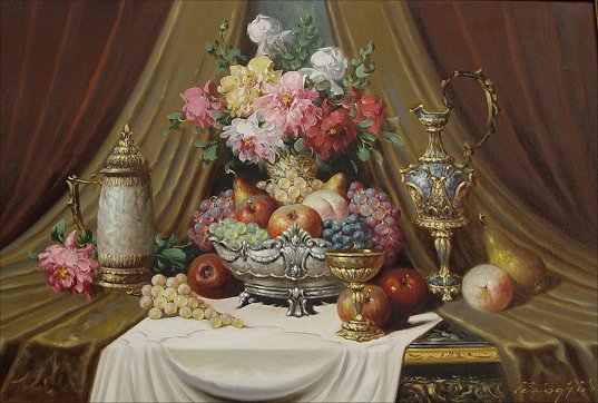BALOGH, Bela, (Russian, 20th C): Neoclassical Still Life with tankard, ewer, center bowl, goblet, floral bouquet and various fruit, O/C, 24'' x 36'', signed lower right and verso.