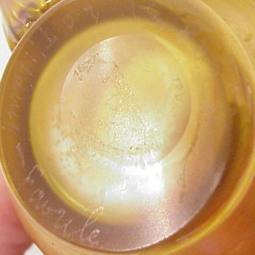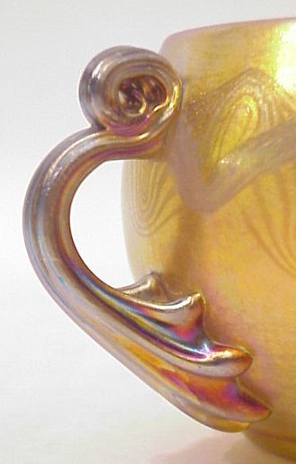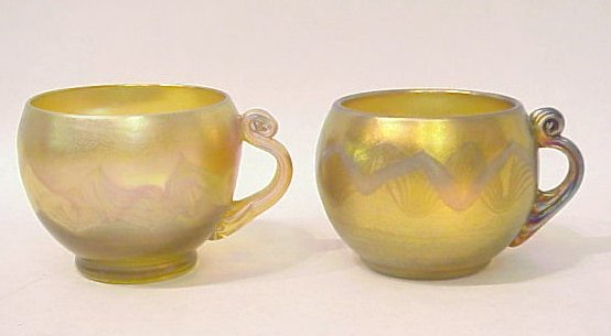 PAIR OF TIFFANY GOLD FAVRILE CUPS: Pulled design on each, though they are not matched pair. Applied scrolled handle. Both are signed LC Tiffany Favrile, one is numbered 698.