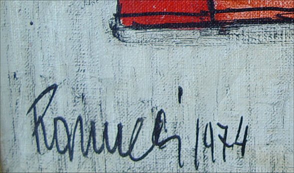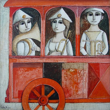 RANUCCI, Lucio, (Italian, 1934-): Musicians in a trolley, O/C, 30'' x 30'', signed lower left, dated 1974, signed verso on stretcher.