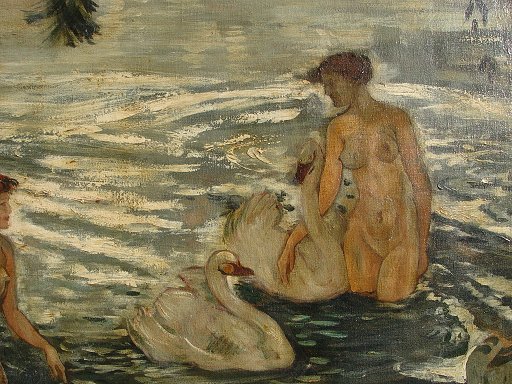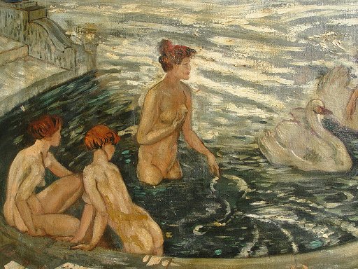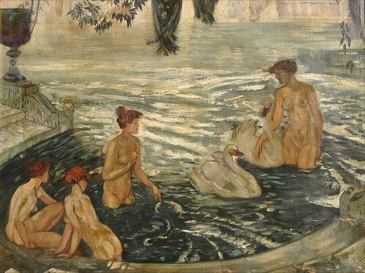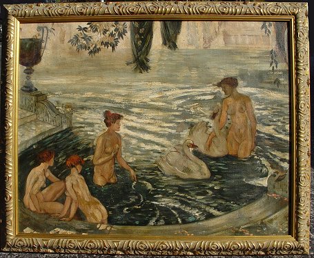 DAVIES, Arthur Bowen, (American, 1862-1928): Nudes bathing with swans in a neoclassical setting, O/C laid down on board, 18'' x 22 1/2'', estate stamp visible verso, encased in a newer gilded frame, overall 21'' x 25 1/2''. Call for condition. Est. $4000/6000**