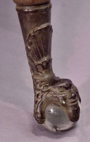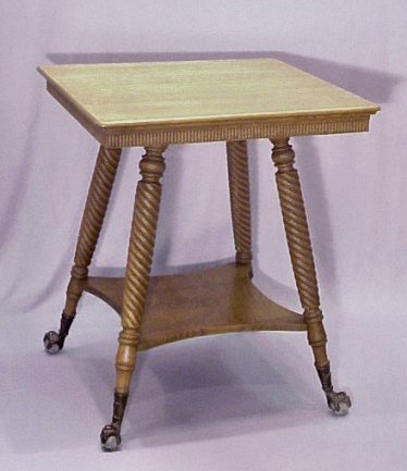 GOLDEN OAK SPLAY LEG PARLOR TABLE: Twist legs ending in glass ball and claw feet. 30 1/2'' X 26'' X 26''