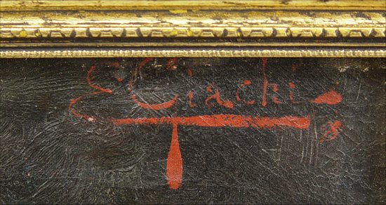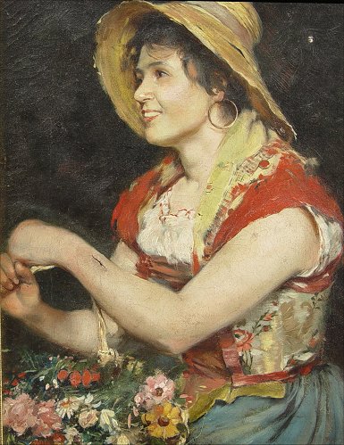 GIACHI, E., (Italian, 19th C): Flower Seller, O/C, 13'' x 9 1/2'', signed upper right, encased in newer gilt frame, overall 14'' x 11''. Condition - Stretcher bar marks surrounding, craquelure throughout, 1''l. tear in wrist, several small punctures, needs cleaning.