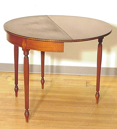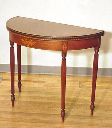 HEPPLEWHITE STYLE INLAID GAME TABLE: Demi-shaped lift top supported by a swing leg. Parquetry and urn design inlay. 30''h, opens to 36'' dia.