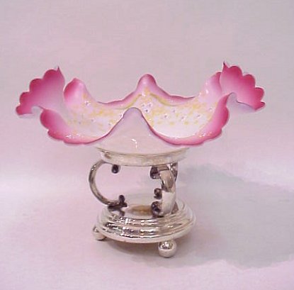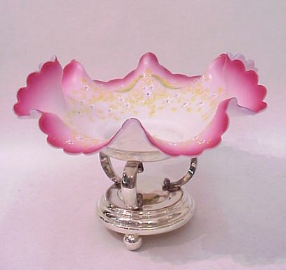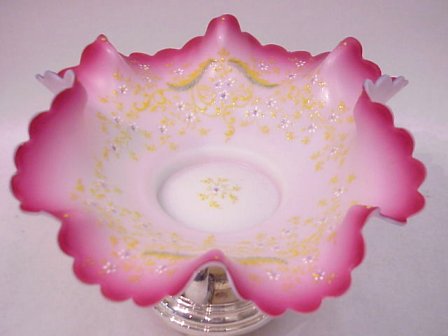 MT. WASHINGTON PEACH BLOW BRIDES BASKET: Enameled decoration on pink to white peachblow bowl with ruffle edge. 3 3/4'' bottom rim, 12'' dia.