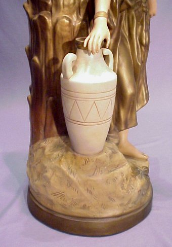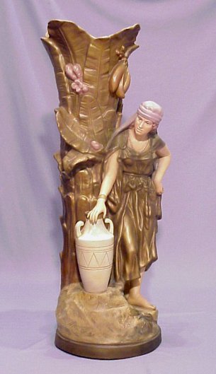 LARGE ROYAL DUX FEMALE FIGURAL FLOOR VASE: Matt glaze in neutral tones. Her headdress has a lavender tint. Pink triangle mark. 37''h. base is 12'' dia.