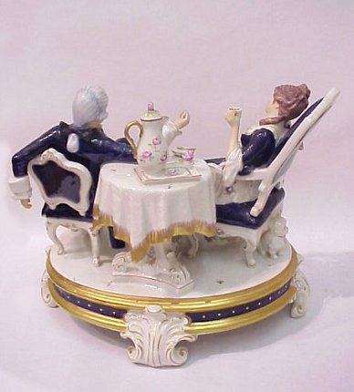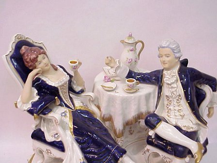 ROYAL DUX PORCELAIN FIGURAL GROUPING: Notice the lifelike expressions and body language of the couple casually enjoying each others company. The cobalt coloration, rose decorated china, and a little poodle hidden behind a chair make a delightful grouping. 12 1/4''h, x 12'' x 14'.