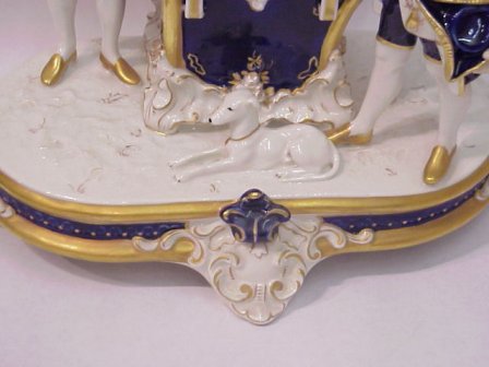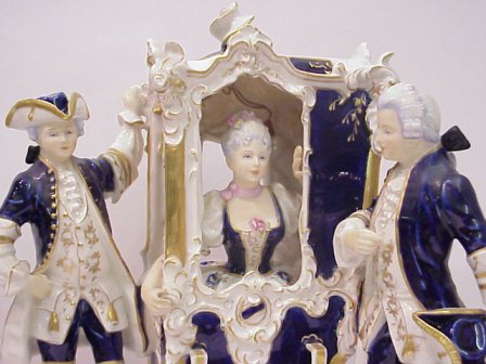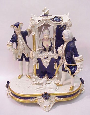 LARGE ROYAL DUX FIGURAL GROUPING: Companion piece to the previous lot. A well dressed woman greeted by two gentlemen. Cobalt glazed porcelain with gold enhancement. 15''h. x 14'' x 19 1/2''.