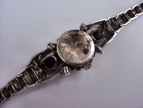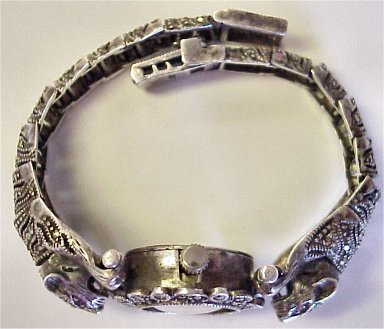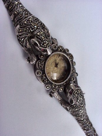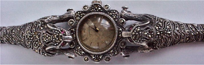 LADY'S MARCASITE LEOPARD WATCH: Wonderful sterling bracelet of marcasite cover links featuring the fore bodies of roaring leopards, red ruby? eyes and bared fangs to each side of marcasite decorated scrolling watch case, clasp and back marked 925. Currently with replacement movement of Swiss works, marked Ernest Borel, 17 Jewel, unadjusted, Longines marbleized dial, keeping correct time. Few missing marcasites, denting to back, safety latch to textured clasp with three adjustable clasp placements. Approx. 7''l.