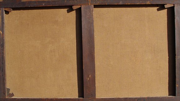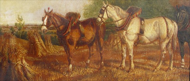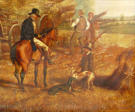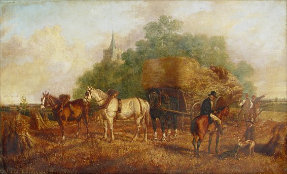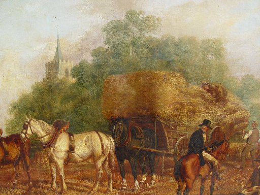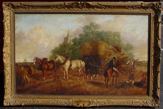 19th C HAYMAKING SCENE WITH FIGURES, HORSES AND WHIPPETS: Church in background, O/C, no visible signature, 24 1/2'' x 40 1/8'', encased in an elaborate later 19th C carved and re-gilded molding, overall 30'' x 45''. Condition - Canvas laid down on canvas and again on canvas on an older reline 19th C stretcher. Call for condition.