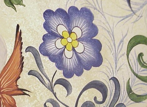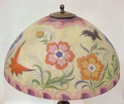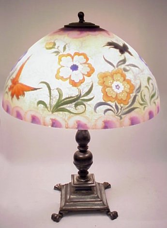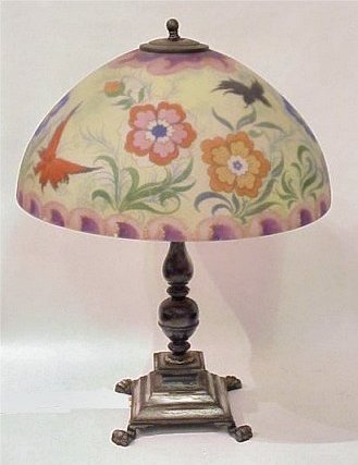 REVERSE PAINTED PAIRPOINT LAMP: Signed base 03075 with paw feet, in original though worn silvered finish. The shade is a colorful butterfly and floral design, signed The Pairpoint Corp. Shade is 15 3/4'' dia., no cracks, slight chips on rim. Lamp is 20 1/2''h. Est. $4000/6000**