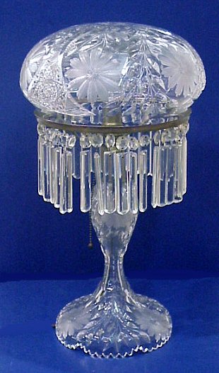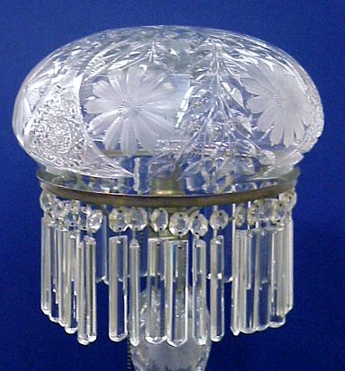 BRILLIANT PERIOD PAIRPOINT QUALITY CUT GLASS TABLE LAMP: Shade and matching base cut in a flower design with hobstars. Prisms hang 5''. 21 1/2''h, shade has a 10''rim.