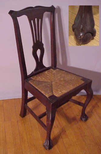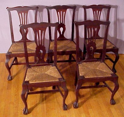 SET OF FIVE BALL AND CLAW FOOT MAHOGANY SIDE CHAIRS: Shaped top rail over pierced slat backs, rush seats, claw and ball feet to the front legs. Approx. measurements are 38''h, 19''w and 15''d. Est. $300/450**