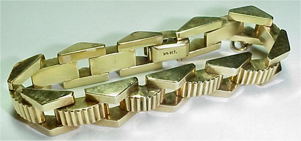14K GEOMETRIC LINK BRACELET: Triangular links march along beside center row of tread top links, approx. 19 grams, diminutive 6 1/2''l., attachment for safety.