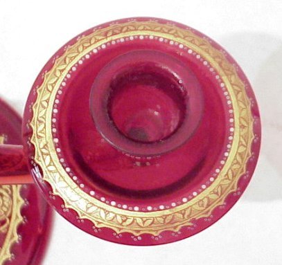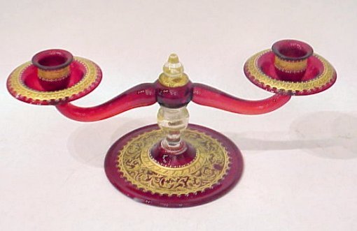 MOSER QUALITY RUBY GLASS CANDLEHOLDER: 2 light ruby blown glass candle holder with heavy gold decoration, white enameling and gold mica flecks to the interior. 5''H, 12 1/4''W.