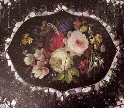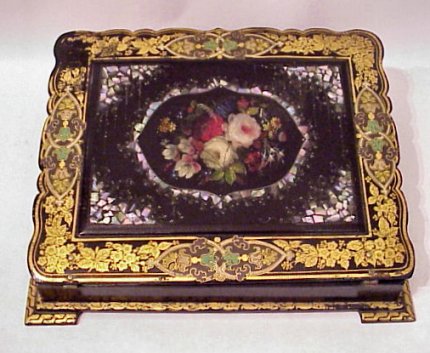 HAND PAINTED PAPER MACHE MOTHER OF PEARL INLAY LAP DESK: The lift top centers hand painted roses framed in a mother of pearl mosaic. Gold and enamel border with paint loss to right corner. Interior of velvet lined surface raises to expose storage. 3 3/4''h, 13 1/3'', 10 3/4'' overall.