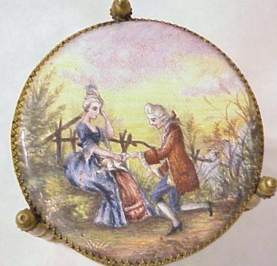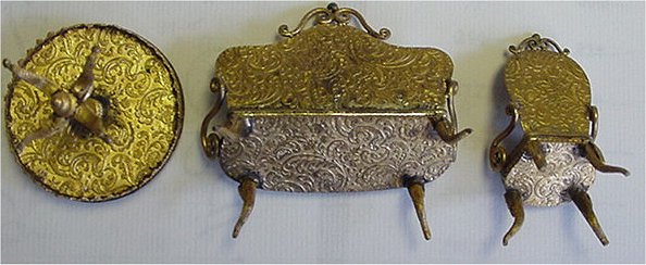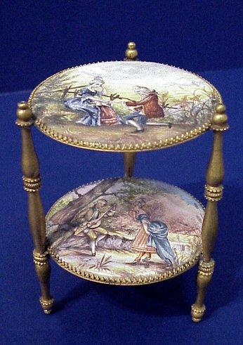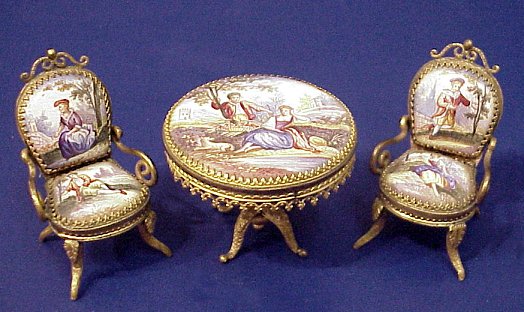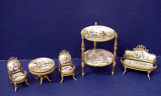 5 PIECE MINIATURE HAND PAINTED AUSTRIAN FURNITURE: Gilt metal and enameled hand painted furniture. Includes a larger 2 tier round table, 3 1/2''h, 2 1/2'' dia. A four piece parlor suite consists of a settee, 2 2/3''l, 2''h, 2 open arm chairs, 2''h. x 1''d. x 1 1/4''w., and a center table, 1 7/8'' dia, 1 1/2''h. There is no chipping or loss of paint to the enamel.