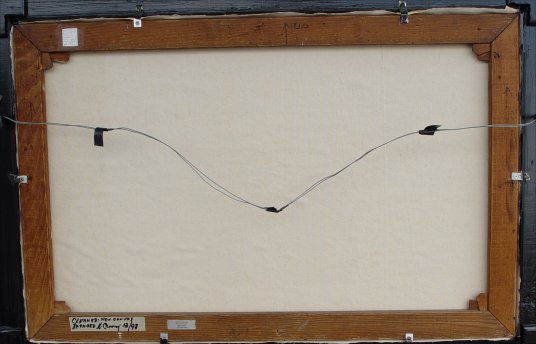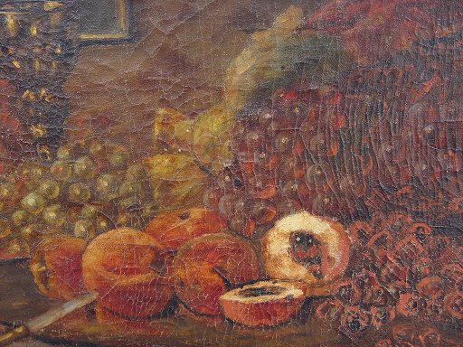 19TH C STILL LIFE, O/C OF FRUIT, GOBLET AND GAME BIRD: 22 1/4'' x 34 1/2'', illegibly signed lower right, encased in newer ebonized and gilded molding, overall 31'' x 42''. Condition - Has been relined, sporadic paint loss throughout with major tear repair in upper left quadrant.