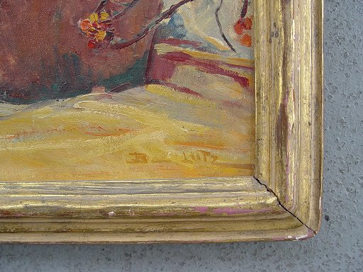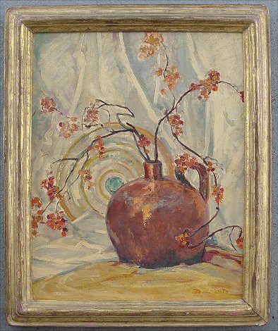 LUTZ, Bertha, (Austrian, 1889-?): Still life of floral spray and handled jug, O/CB, 20 1/2'' x 16 1/4'', signed lower right, encased in period gilded gesso frame with wear throughout and slight separation in lower right and upper left corners, overall 23 3/4'' x 19 1/2''. Condition - Needs cleaning, some minor scrapes in upper right quadrant.