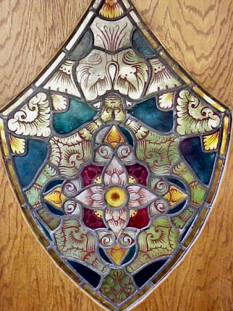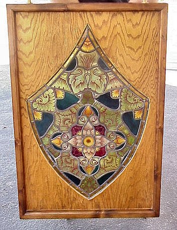 ANTIQUE STAINED GLASS WINDOW IN THE SHAPE OF A SHIELD: Red, amber, green, and turquoise colored glass. Framed and ''matted'' in wood. 43 1/2'' x 29''. Est. $400/600**