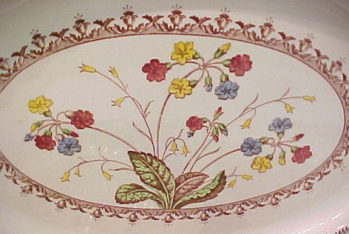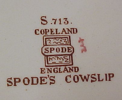 COPELAND SPODE ''SPODE'S COWSLIP'' CHINA SERVICE: 39 pieces of old English earthenware china to include 12 dinner plates, 8 cream soups with underplates, 8 cups and saucers, 7 bread plates, 2 oval vegetables, a square serving bowl, and a platter. Discoloration to 2 of the serving bowls.
