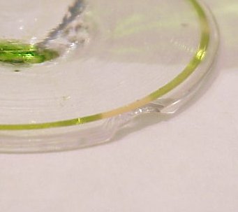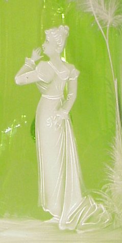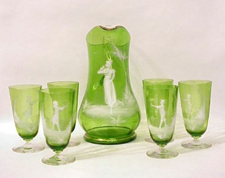 MARY GREGORY GLASS PITCHER AND SIX MATCHING STEMS: White enameling on green glass. Gold rims, applied clear handle to pitcher. Pitcher shows image of woman is 11 3/4''h. Tall footed stems are 6 1/4''h. Please note chip to base of one stem.