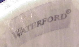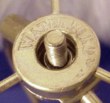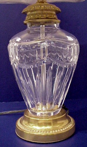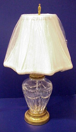 WATERFORD CRYSTAL TABLE LAMP: Signed Waterford cut crystal, brass mounted lamp with shade. Shade bear a sticker label ''Waterford Shade 931800''. Shade is original to lamp. 21''h. overall.