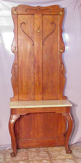 OAK HALL TREE: Marble shelf, cabriole legs. 80''h, 33''w.