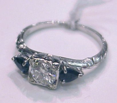SPARKLING DIAMOND AND SAPPHIRE RING: Centered by a round transitional brilliant cut diamond of approx. 51cts, J VVS2, flanked to each side by pear cut sapphires approx. 1/4ct each. Sapphires average B VS. Set in lovely etched mount of 14k white gold, approx. 2 grams, size 6 3/4. Sold with current retail replacement appraisal, value $2150. Est. $1000/1500**