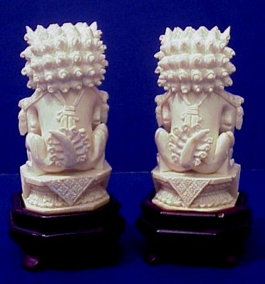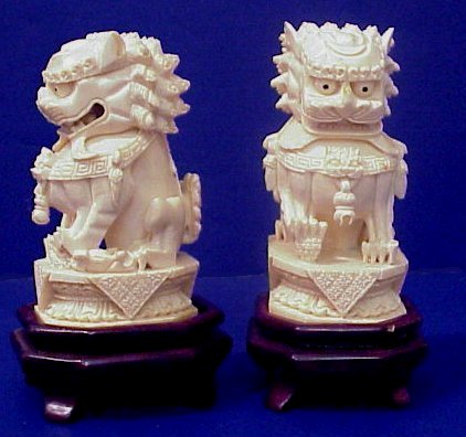 PAIR OF CARVED IVORY FOO LIONS: Highly detailed carved lions featuring free roaming balls in each of their mouths. 4''h excluding the wood octagonal bases. 2 1/2''l. Est. $350-450**