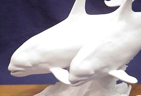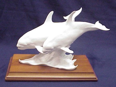 KAISER PORCELAIN ORCA WHALES: All white porcelain statue of two Orca whales in graceful motion. Limited edition of 4000. 17''l, 10''h. On a custom fitted wooden base. 1''h.