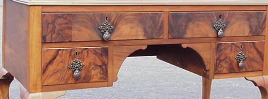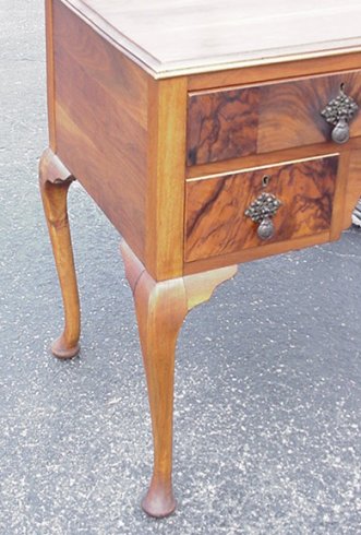 VANITY WITH THREE SECTION MIRROR: Walnut with burl walnut veneer drawer fronts, three section beveled mirrors, Queen Anne legs