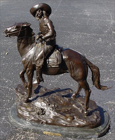 REMINGTON BRONZE RECAST OF HORSE AND RIDER: 22 1/2''h., affixed to a variegated marble plinth, incised signature, #4/50.