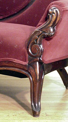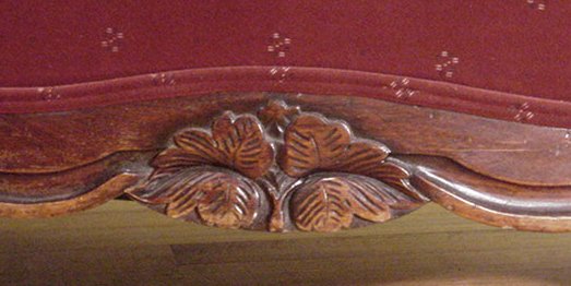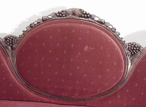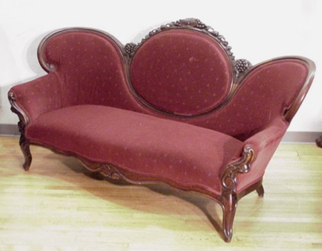 WALNUT MEDALLION BACK VICTORIAN SOFA: Elaborate carving of fruit at center of medallion. 77''l. x 32''w. 40''h.