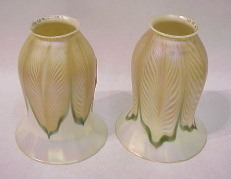 PAIR OF QUEZAL ART GLASS LAMP SHADES: Signed on the fitter rim. Iridised gold pulled feather design outlined in green. 6 1/4''h, rim is 2 1/8''dia. No chips or cracks.