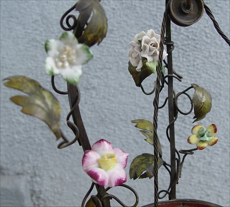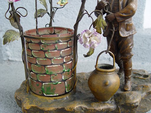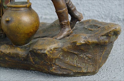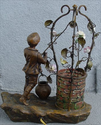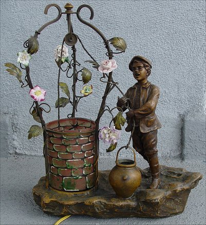RANIERI, Aristide de, (Italian, 19th/20th C): Patinated spelter and hand painted porcelain figural lamp with inset reverse painted faux brick shade, 13''h., signed in base. Condition - Several minute flecks to flowers, slight bend to well framing.
