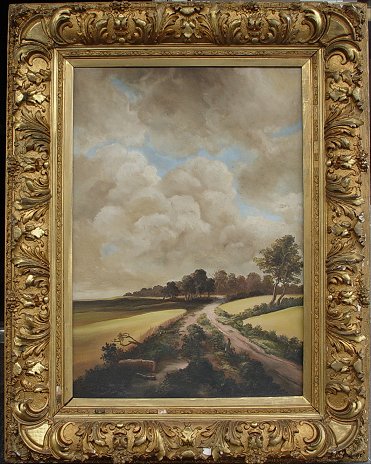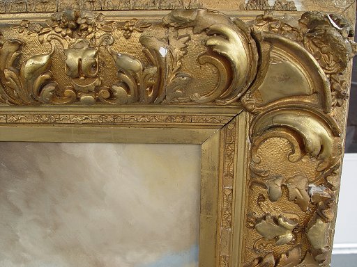 LARGE O/B AFTER RUISDAEL IN MUSEUM QUALITY 19TH C ELABORATE GILDED MOLDING: 37'' x 25 3/4'', overall 50 1/2'' x 39 1/2'', frame has had extensive touch ups and re-gilding and will need further work to chipped gesso and missing portions of border.