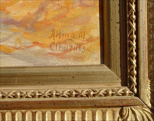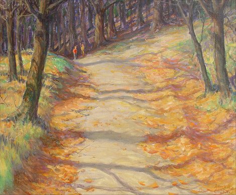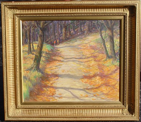 CLEMENTS, Alling, (American, 1891-1957): Figures walking along a wooded trail, O/Panel Board, 20'' x 24'', signed lower right, encased in gilded contemporary molding, overall 28 1/4'' x 32 1/4''. Clements was born in Rochester NY, studied at the Arts Student League, Charles Woodbury, and RIT.
