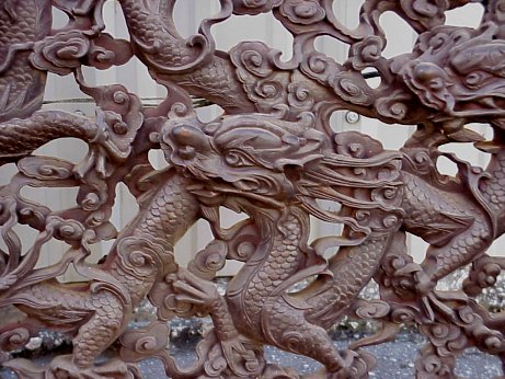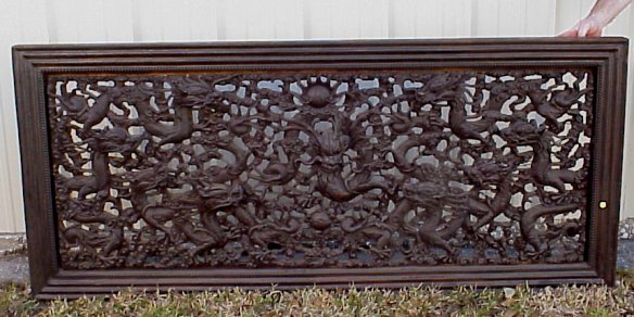 FANTASTIC CARVED ROSEWOOD DRAGON MOTIF PANEL FROM BUDDHIST TEMPLE: Elaborately carved in rosewood with large central dragon under sun over a moon, surrounded by eight additional dragons, large beaded rosewood frame, 77'' x 33 1/2'' x 2 1/2''.