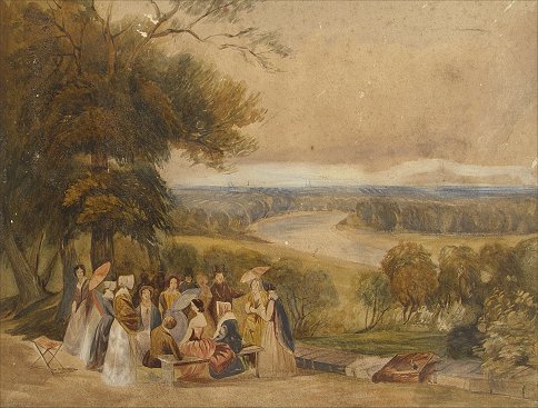 19TH C W/C, PICNIC ON THE HUDSON: 9'' x 11 3/4'', unsigned, laid on cardboard. Condition - Brown stained paper with several scuff marks.