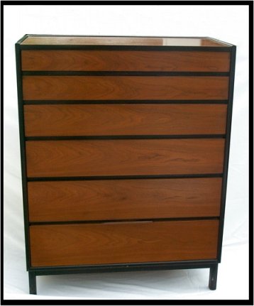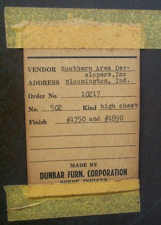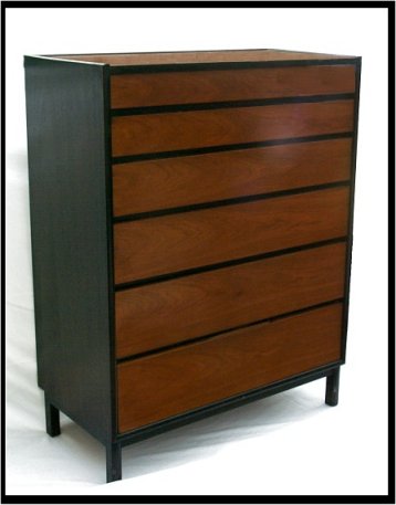 EDWARD WORMLEY HIGH CHEST FOR DUNBAR: 6 drawer tall chest, approx. 46 1/2''h., x 36'' x 18''. Walnut in 1750 and 1890 finish. Big D label for Dunbar. Matches the double dresser and nightstands we are also offering.