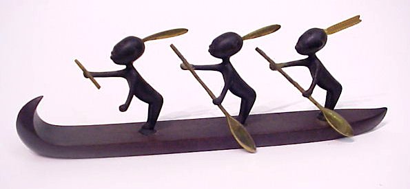 HAGENAUER AUSTRIAN BRONZE SCULPTURE: Three bronze natives in a wooden canoe. Impressed with Hagenauer mark, Made in Austria, handmade. Please note replaced feather, missing lower half of front paddle and unattached middle paddle. 7 1/2''l., 2 1/2''h.