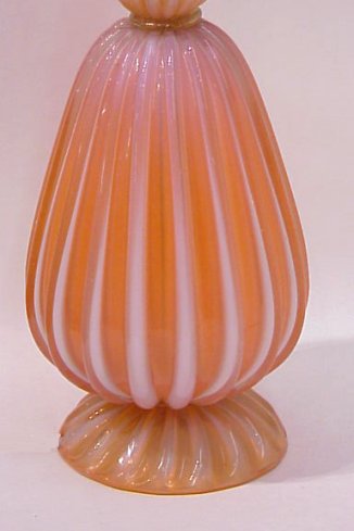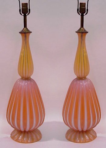 PAIR OF HIGH STYLE MURANO GLASS LAMPS: Stripes of peach and iridised white under ribbed clear glass. 3 part assembly with rings of glass with gold inclusions. 24 3/4''h. for the glass alone, with harps the lamps are 40''h.