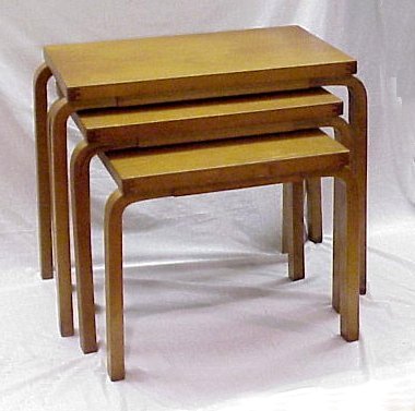 SIGNED ALVAR AALTO NEST OF 3 TABLES: Aalto design for Finsven Inc. 3 graduated tables with bentwood legs. The largest is 24 1/2''h, x 27'' x 16 1/2''. Stamped mark.