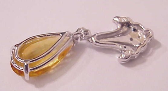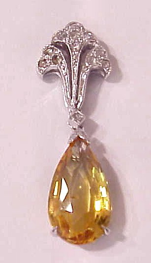 LOVELY CITRINE PENDANT: Briolette cut citrine of approx. 4.38ct, set in 14k white gold filigree mount accented with 14 full cut diamonds, approx. .21ctw, marked 585 and makers mark, approx. 1 5/16''l., ready for your delicate chain. Matching earrings coming up.