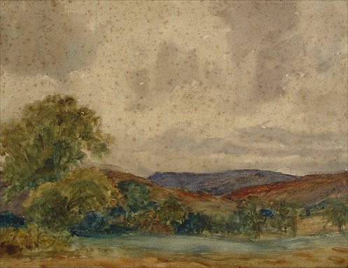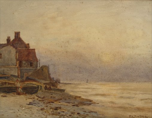 FORBES, Patrick Louis, (British, 1893-1914): Pair of W/C landscapes, ''In Yorkshire'', ''The Beach, Sheringham'', both 10'' x 14'', only one signed. Condition - Heavy foxing in Yorkshire, lighter foxing in Sheringham with some scratches in lower corner. Both pieces with some staining.