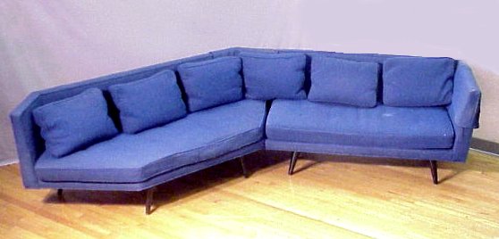 DUNBAR 2 PART SECTIONAL SOFA: Straight end with one end open and the section with angular ends. Blue fabric appears to be original. Pillows across the back. From the estate with the Wormley Dunbar table at lot 117C.